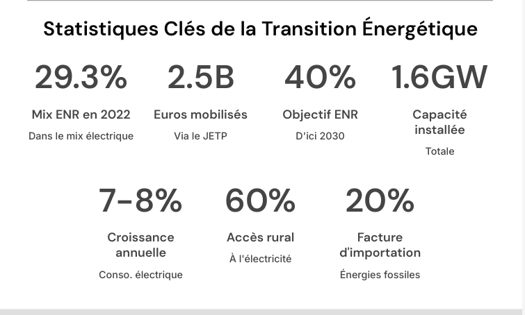 1.6 GW, avec une consommation électrique en croissance annuelle de 7-8%.Tandis que l’accès à l’électricité est presque universel en zone urbaine, il atteint environ 60% en milieu rural. Soutenu par 2.5 milliards d’euros du Partenariat pour une Transition Énergétique Juste (JETP), le pays s’est fixé pour objectif d’atteindre 40% d’énergies renouvelables d’ici 2030, intégrant de grands projets solaires et éoliens, explique la même source.